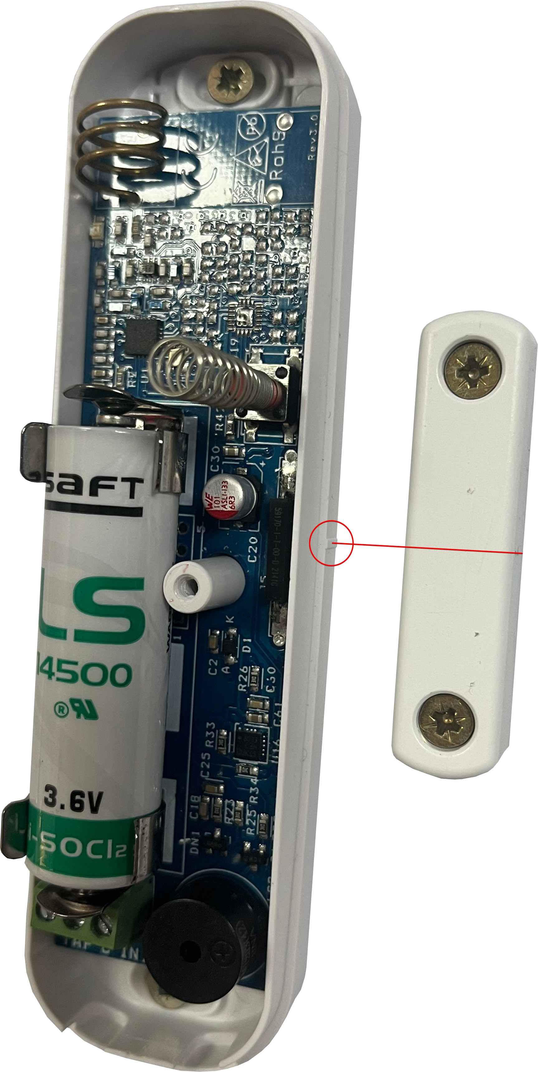 - Screw/mount the magnet part of the contact next to the casing, ensuring to line up the centre of the magnet with the indicator on the side of the main casing, as shown below