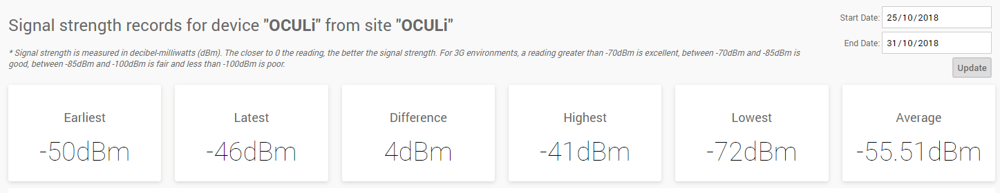 Signal strength is recorded in decibel-milliwatts (dBm).