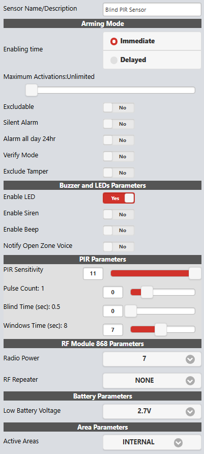 - PIR Sensitivity - Alter the sensitivity of the PIR sensor (higher = more sensitive)