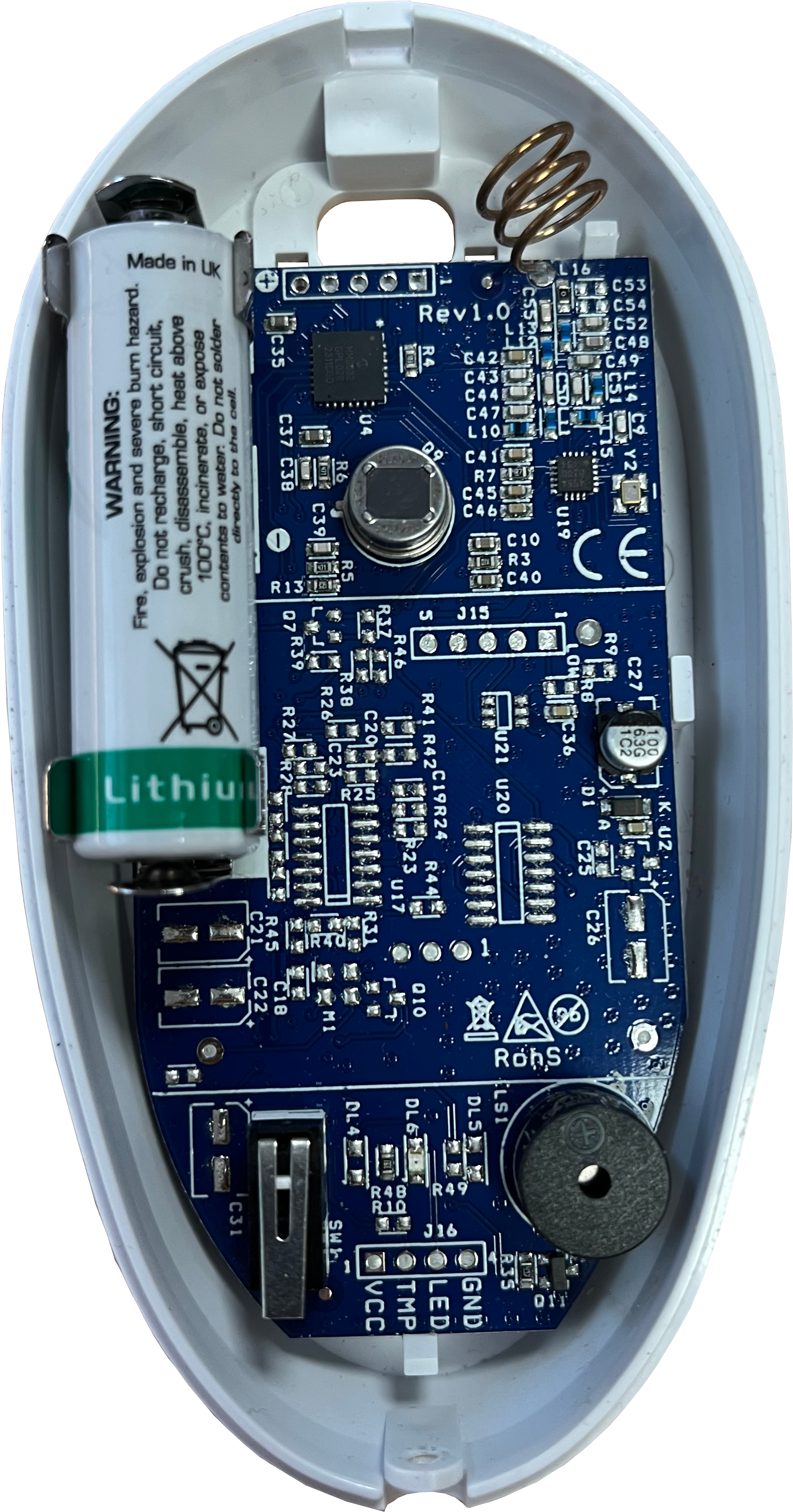 - Connect the battery to the detector, and within 5 seconds of connecting the battery, press the tamper switch twice