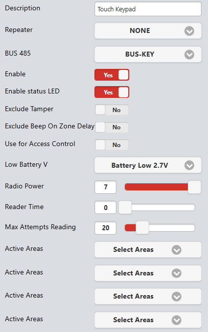 - Radio Power - Sets the power for the RF antenna in the device (if the device is mounted far from the contranel, ensure this is set to maximum)