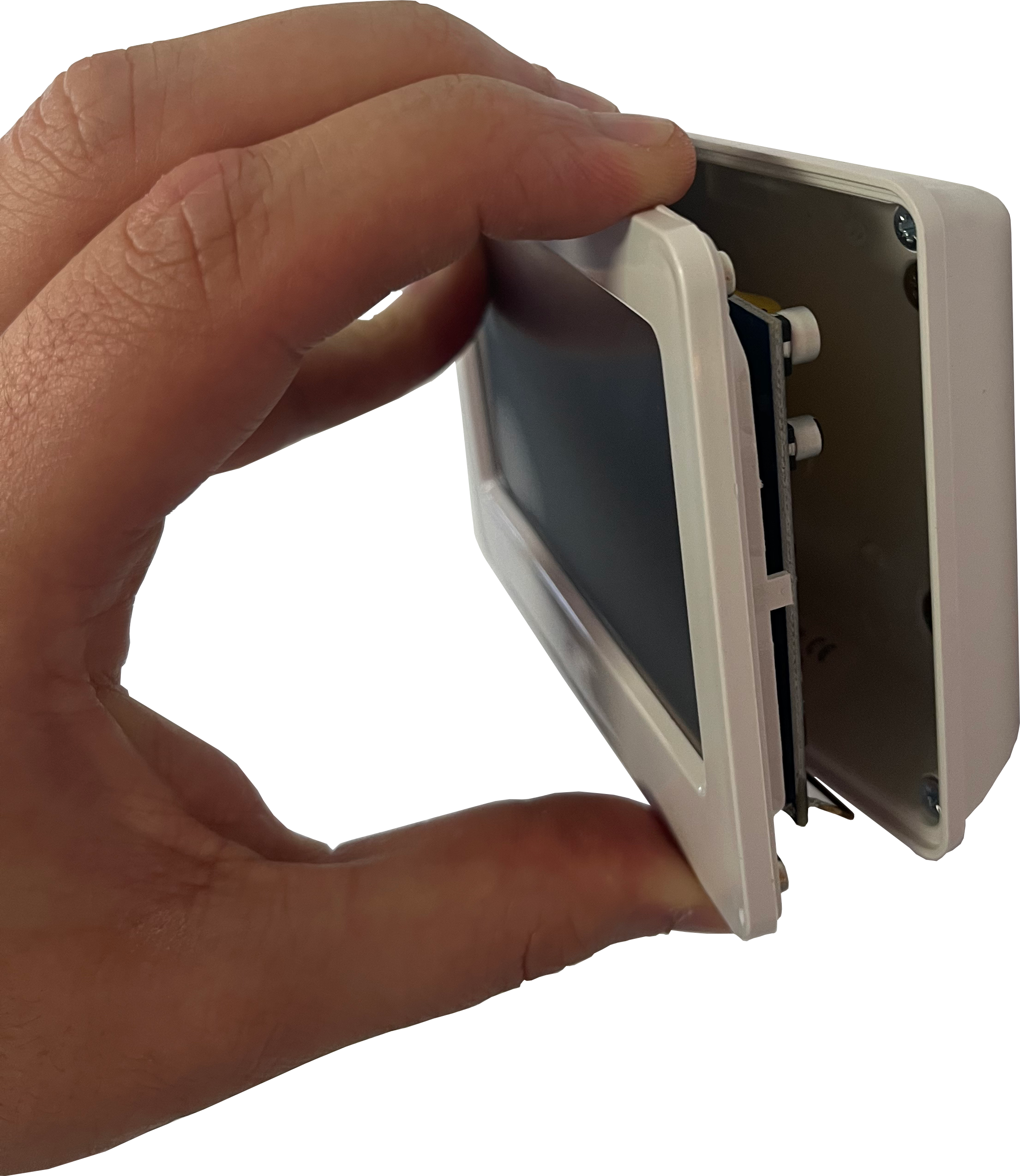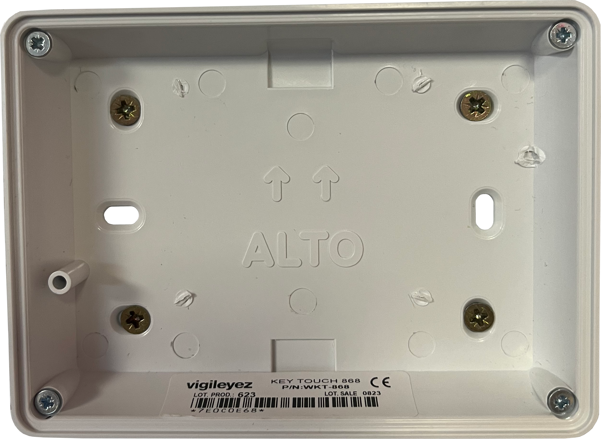 To install the touchscreen keypad, mount the backplate to a flat surface. Once done, place the keypad onto the backplate (it is held in place by magnets on each corner). Once done, insert the securing screw at the bottom of the device (underneath).